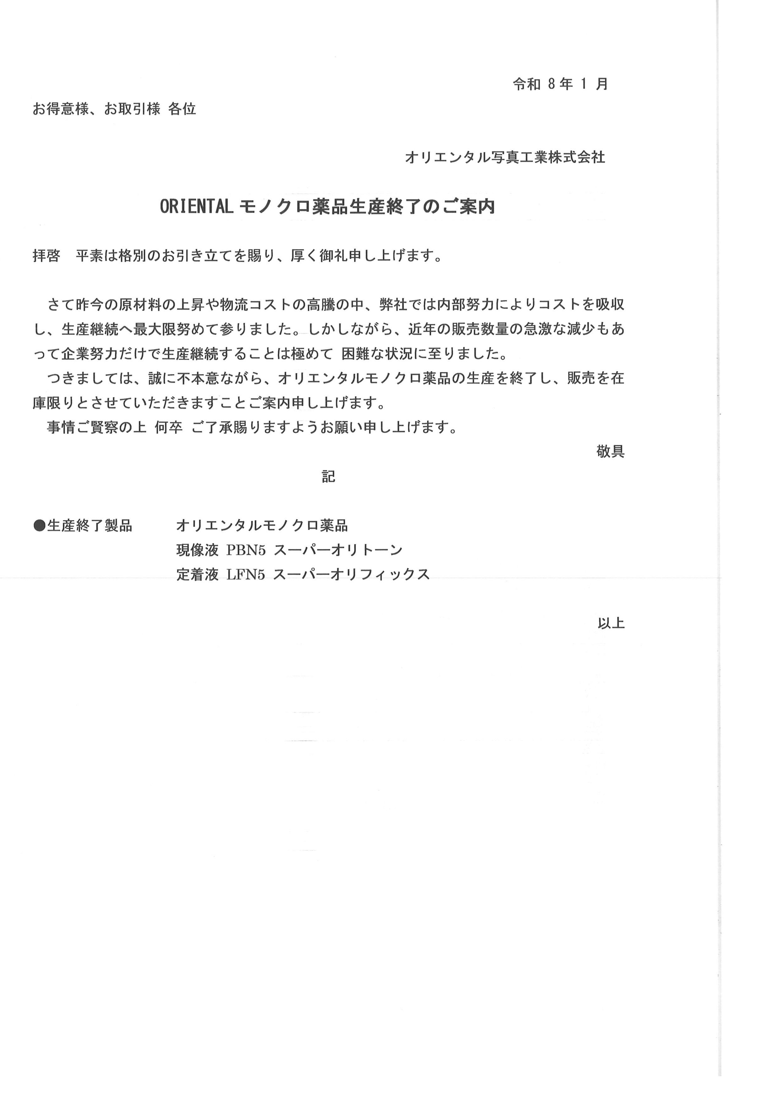 ORIENTALモノクロ薬品販売終了のお知らせ